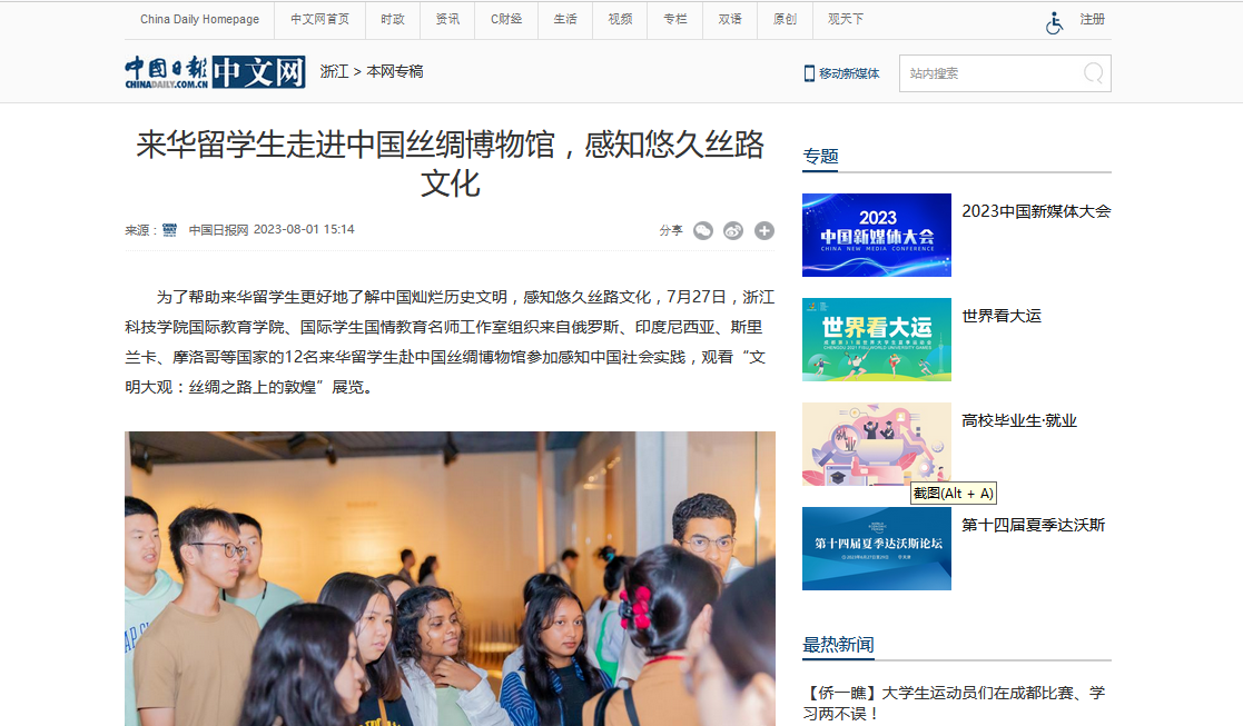 为了帮助来华留学生更好地了解中国灿烂历史文明,感知悠久丝路文化,7月27日,开云手机入口国际教育学院、国际学生国情教育名师工作室组织来自俄罗斯、印度尼西亚、斯里兰卡、摩洛哥等国家的12名来华留学生赴中国丝绸博物馆参加感知中国社会实践,观看“文明大观:丝绸之路上的敦煌”展览。