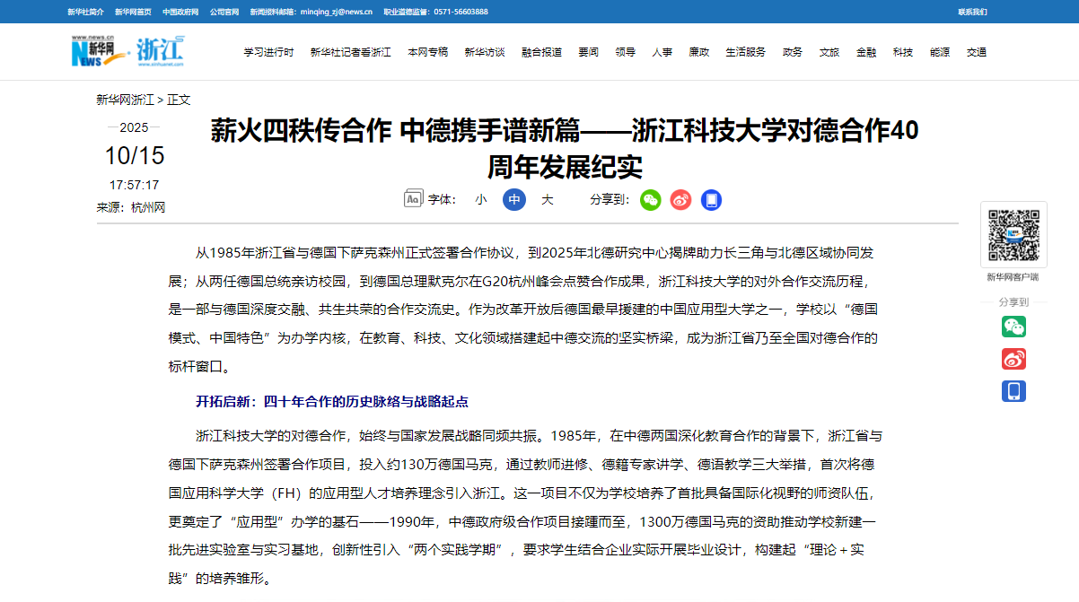 新华网:薪火四秩传合作 中德携手谱新篇——浙江科技大学对德合作40周年发展纪实