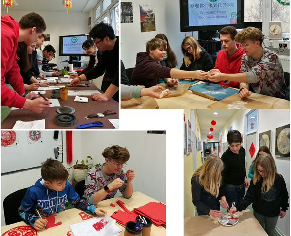 除夕当日,埃尔福特孔院内的中国新年活动热火朝天地进行着。埃尔福特孔子学院携手东亚协会,与埃尔福特福音综合中学师生们举办了一场别开生面的中国农历新年庆祝活动。孔院中方院长贾峰昌向德国学生介绍了中国中小学生的日常生活,学生们十分好奇,踊跃提问,想要了解异国他乡的同龄人们都是如何学习和生活的。随后来自5-9年级的学生分为四组,轮流体验中国文化。他们跟随书画杜老师和东亚协会莱娜女士一起,尝试运用中国传统的水墨竹笔,在宣纸上描绘出一根根笔挺的竹子。筷子对于德国人而言也是非常新鲜的事物,作为“筷子夹乒乓球”的低配版游戏,用筷子夹千纸鹤对他们而言也是不小的挑战,但同学们兴致勃勃,并不在意,重要的是去体验不同的东西。剪纸角落也挤满了同学,他们亲手剪出“福”字,庆贺新年的到来。他们还体验了汉语课程,初识中国语言和文化知识。同学们跟随孔院老师,纷纷拿起面团,擀皮、包饺子,最后品尝了自己亲手包的饺子,饺子形状各异,味道鲜美,学生们内心充满了成就感。孔院还为德国师生送上了新年福袋,将“福”送到了他们每个人手中。