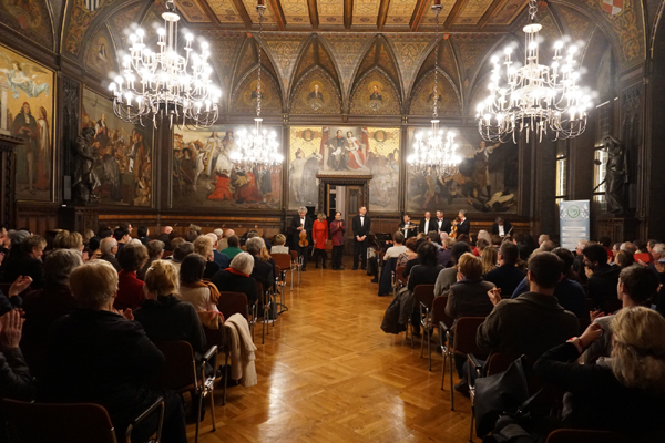 除夕前,埃尔福特孔院邀请德音乐家杜建国先生携手莱比锡新沙龙管弦乐团在埃尔福特市政厅大厅奏响华丽的音乐篇章,以乐会友,为当地市民奉献一场中西合璧的音乐盛宴。这已是埃尔福特孔院连续第三年在中国新年前夕举办新年音乐会,受到越拉越多当地市民的欢迎。今年还出现了开演前门票告罄,很多观众在外面等候不愿离去的场面。