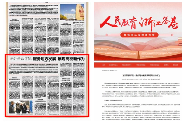 全省教育大会召开在即,《浙江日报》、浙江在线等媒体梳理浙江高校发展样本,展现浙江教育改革发展的重大成就,以《服务地方发展 展现高校新作为》为题,聚焦我校产教融合,培养高素质应用型人才;产学研合作,为企业发展提供原动力;发挥国际化优势 搭建桥梁助力企业“走出去”。