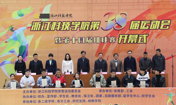 4月11日下午,校第三十八届运动会开幕式小和山校区体育馆举行。校党委副书记符宁平、副校长冯军、纪委书记陆爱华等出席开幕式并为受表彰的2018年度校“群众体育先进单位”和“学生十佳运动员”代表颁奖。校体育运动委员会全体成员、2018年度受表彰单位和个人代表、各参赛代表队运动员代表参加开幕式。