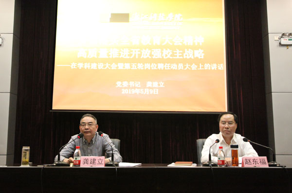 5月9日,学校召开学科建设大会暨第五轮岗位聘任动员大会。校党委书记龚建立讲话,校长赵东福作主题报告。校党政班子成员出席会议。