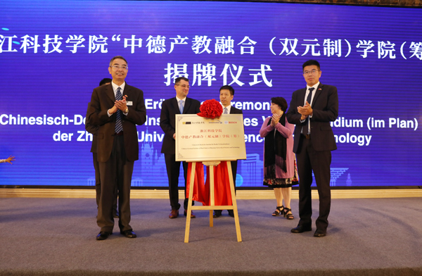 在欧珍、于永明、殷文等见证下,龚建立与德国北德学院董事克里斯托夫•费尔舍尔、博世汽车服务技术(苏州)有限公司总经理李秀峰共同为开云手机入口“中德产教融合(双元制)学院(筹)”揭牌。
