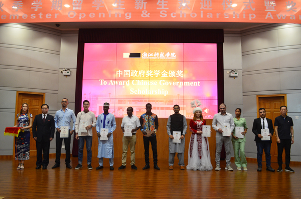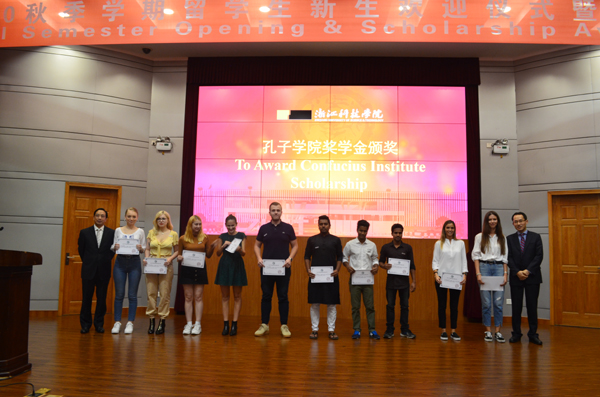 出席活动领导与嘉宾们为中国政府奖学金、孔子学院奖学金、浙江省政府奖学金、优秀学历生奖学金、优秀学风奖学金、单项奖学金、优秀新生奖学金获得者颁发了获奖证书,并为新生代表佩戴校徽。