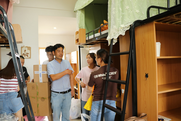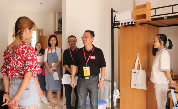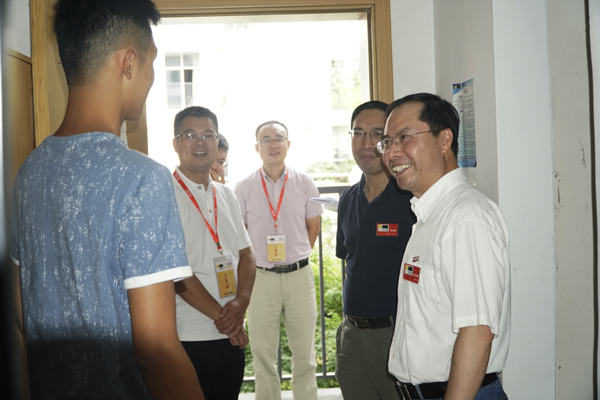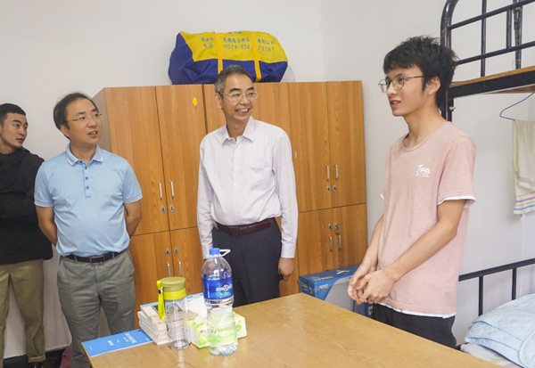 当天,校党委书记龚建立、校长叶高翔等领导在相关职能部门负责人的陪同下,来到迎新现场指导慰问,他们详细查看了各迎新接待点,向迎新工作人员询问新生报到情况,嘱咐相关部门和学院一定要对新生报到细节、饮食住宿充分考虑,为新生和家长提供便利。校领导还来到宿舍,走访看望2018级新生和家长,向他们介绍学校特色和发展概况。校领导勉励新生,及早适应新生活,珍惜时光,努力学习,用青春书写精彩人生。