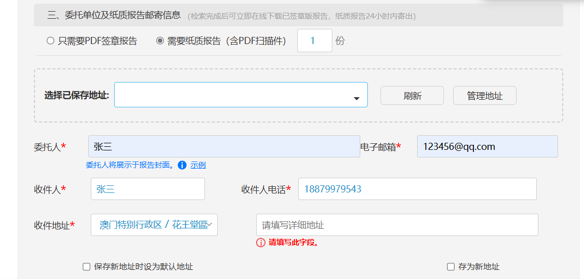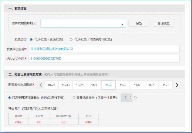 图例4  填写费用及发票信息(仅“查收”服务开具收录证明涉及)