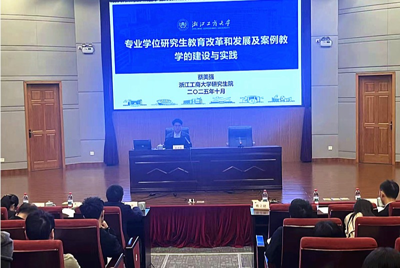 蔡美强教授作题为《专业学位研究生教育改革和发展及案例教学的建设与实践》的报告,他从国家政策背景、浙商大方案、主要举措和行动、案例建设与实践等四方面阐述了专业学位研究生案例教学的必要性和重要性,建议导师积极进行研究生案例教学。